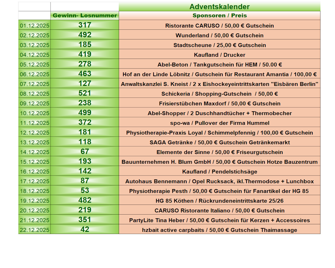 Die HG 85 Köthen e. V. wurde am 29. April 1985 ins Leben gerufen, eine Initiative von Klaus Franke (†), dem damaligen Vorsitzenden des Rates des Kreises Köthen. Zu den Gründungsmitgliedern zählten Persönlichkeiten wie Dr. Wolfgang Grobler (†), Helmut Borrmann (†), Gerhard Pommert (†), Martin Münstermann und Gerhard Döhring.