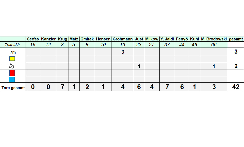 HG 85 Köthen: Christian Kanzler, Leonard Serfas; Benet Fenyö 6, Lukas Krug 7, Tim Gmirek 2, Frank Grohmann 4/3, Moritz Brodowski 3, Sebastian Kuhl 1, Justin Milkow 4, Jakob Hensen 1, Yasin Jaidi 7, Steven Just 6, Laurenz Brodowski 3
