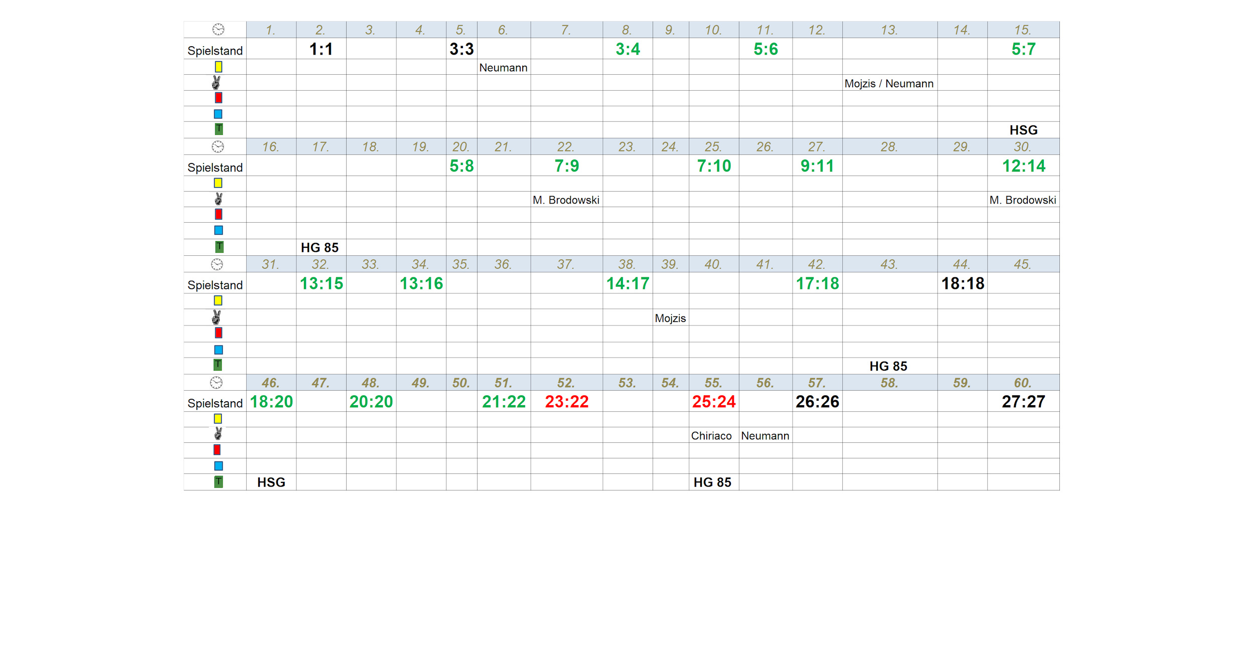Der Start in die zweite Spielhälfte war eine zähe Angelegenheit. In den ersten sieben Minuten fielen nur drei Tore: Je eins durch Jakob Hensen und Lukas Krug und ein Treffer durch Marc Schreiber. Zwischen der 38. und 52. Minute musste die HG 85 Köthen eine kritische Phase absolvieren. In dieser nutzte der an diesem Abend mit wenigen erfolgreichen Impulsen agierende Benet Fenyö einen weiteren Strafwurf nicht. Die Ein-Tore-Führung (23:22) der Freiberger wandelten Justin Milkow und Yasin Jaidi zwei Minuten später wieder zum Ein-Tore-Vorsprung um (23:24). Die finale Entscheidung wurde durch einen verwandelten Strafwurf von Domenik Gelnar (27:26 / 59.) und Yasin Jaidi (27:27) 13 Sekunden vor Schluss inszeniert. Mit dieser Punktteilung stabilisierte die HG 85 Köthen ihren Platz im Mittelfeld der Tabelle.