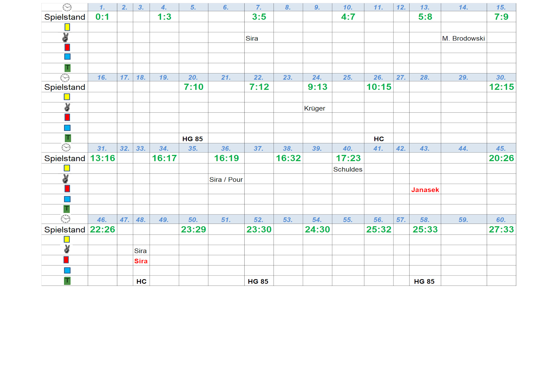 Lukas Krug eröffnete das Spiel mit einem Doppelpack (0:2 / 2.). In Überzahl, Jakub Sira saß auf der Strafbank, erzielten Justin Milkow und Steven Just die 3-Tore-Führung (4:7 / 10.). Zwischen der 16. und 22. Minute gelang dem HC kein Treffer, hingegen den Gästen weitere drei, die zur zwischenzeitlichen 7:12-Führung (22.) beitrugen. Mi dem ersten Strafwurf des Spiels, den Steven Just zum 9:14 nutzte, blieb dieser Abstand konstant. Bis zur Halbzeit näherte sich der Gastgeber auf einen 3-Tore-Abstand.